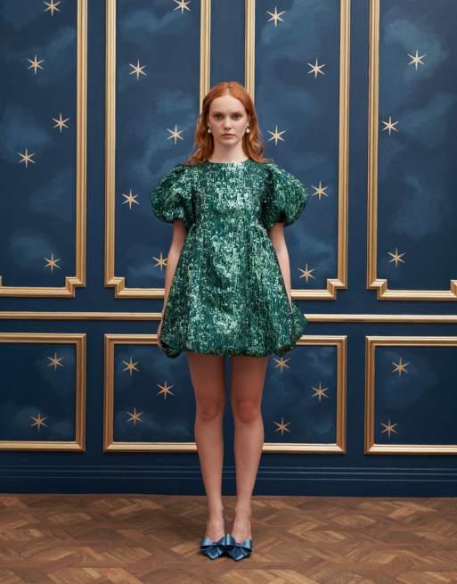 Sister Jane グリーンミニドレス Sister Jane puff sleeve mini jacquard dress in emerald green | ASOS