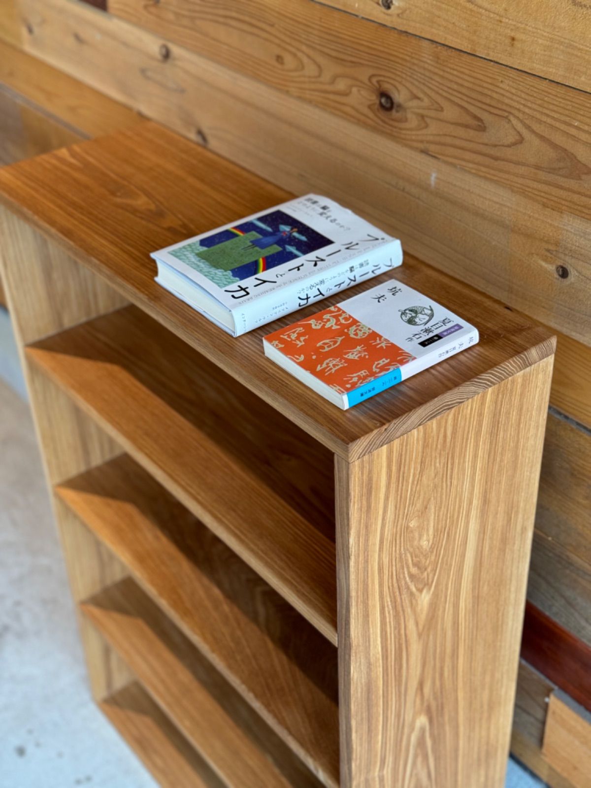 - 家具 > 本棚・絵本棚・マガジンラック > 天然タモ材を使った棚 シェルフ 無垢材 木製 一枚板 おまけ積木付き 本棚 天然タモ材を使った棚シェルフ無垢材木製一枚板おまけ積木付き本棚