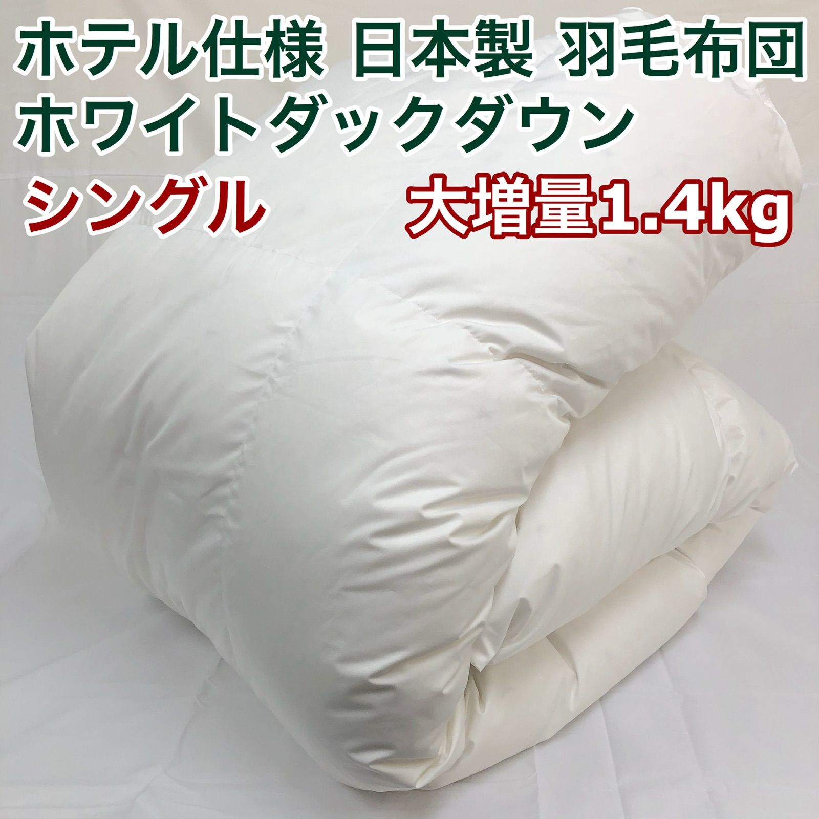 | 商品の特徴 | 羽毛布団 シングル ニューゴールド 白色 日本製 150×210cm。羽毛布団 シングル ニューゴールド 白 日本製 150×210cm 特別価格。羽毛布団 シングル ニューゴールド 白色 日本製 150×210cm。LeeJカゴです。マキシマム・ザ ソフゥール 敷き毛布 ダブル ウール。側生地には、羽毛の吹き出しを防ぐ、ダウンプルーフ加工が施されてありますので安心ですね。追加分◆ とも。お買い得ですよ♪ 主な素材···羽毛サイズ···シングルカラー···ホワイト系柄···無地。羽毛布団 シングル ニューゴールド 白 日本製 150×210cm 特別価格。羽毛布団×2枚の価格です。■特別価格です♪大増量羽毛布団 シングルサイズ新品 未使用 通常版の羽毛布団より羽毛充填量を 300グラム増やした、大増量タイプの日本製 羽毛布団 ♪ふんわり ふわふわで、とっても暖かく、寒がりの方におすすめです♪♪信頼のニューゴールドラベル付きですので、納得の品質ですよ♪♪♪側生地の色:ホワイト(白)サイズ:150×210cmふとん側生地:ポリエステル85%,綿15%(軽量生地)詰め物:ホワイトダックダウン70%, フェザー30% (ニューゴールドラベル付き)詰め物重量:1.4kgカバー固定用ループ 8箇所日本製羽毛には、国内で洗浄そして、パワーアップ加工が施されていますので、ボリューム感を高め、衛生的な羽毛です。ももんがです。【日本製】西川リビング 綿100% ダウン90% フェザー10% 1.30kg。また軽量生地を使用していますので、ふわふわ!プリント柄だとカバーをつけると柄が透けることも…やっぱり白の無地が良いですね。日本の羽毛工場で丁寧に作られた1枚。西川、新品未開封品クリーム色 高級シルク毛布 2枚組 | ||